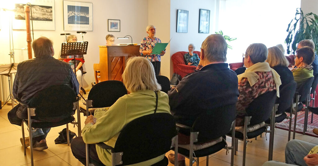 21. März 2026 – Unter dem Motto „Frühling ist´s!“ präsentieren Ursula Nöldgen (Rezitation), Uta Drehsen (Klavier) und Bettina Scholz (Flöten) am 21. März 2026 im Gemeinschaftsraum des vom Verein Alternatives Wohnen entwickelten Wohnprojektes Steinstraße 20 in Lechenich ein unterhaltsames Programm passend zur Jahreszeit. Während Ursula Nöldgen Texte von Mörike, Rilke, Droste-Hülshoff und Zeller vorträgt, spielen Uta Drehsen und Bettina Scholz Werke von Telemann, Bach und Diabelli